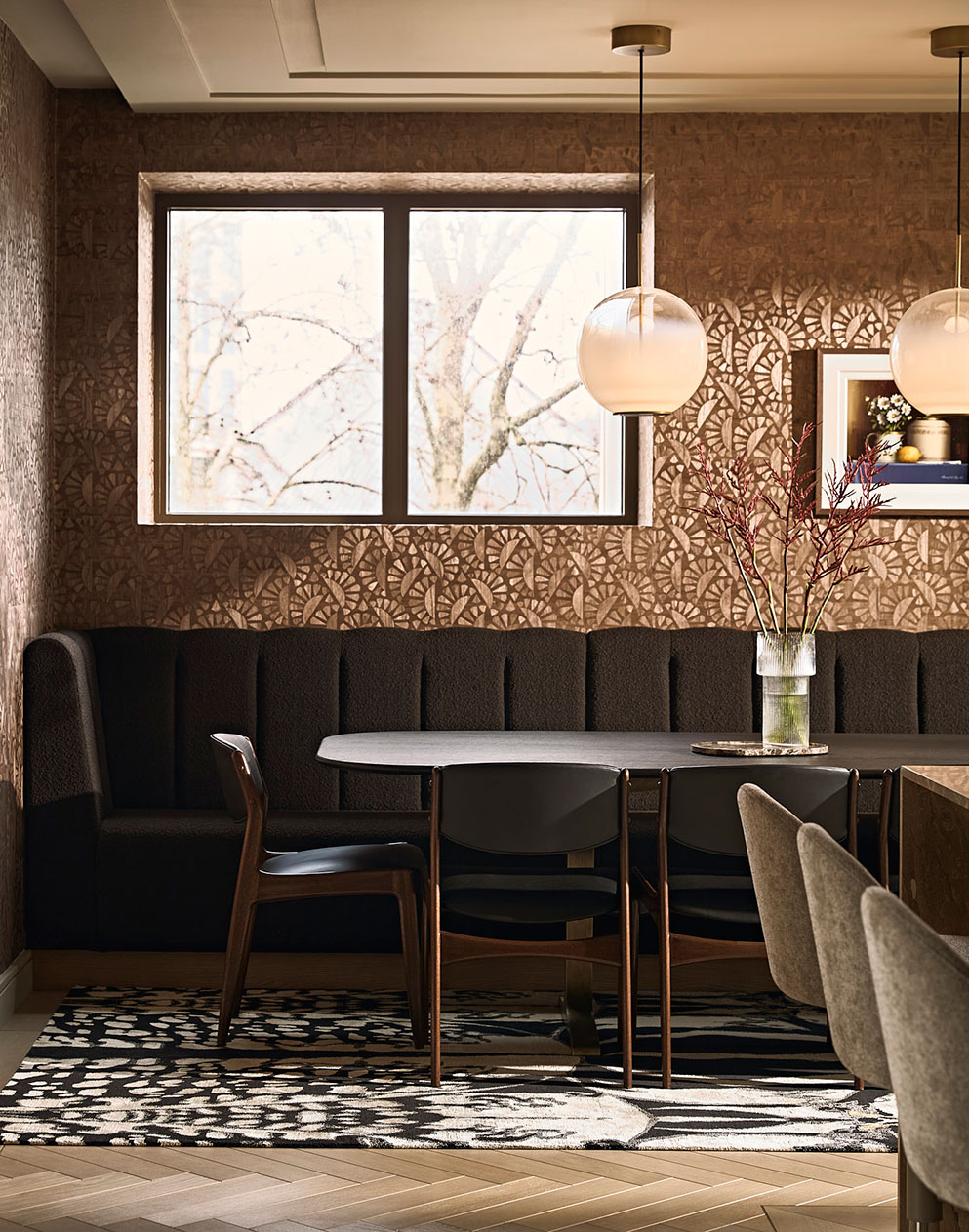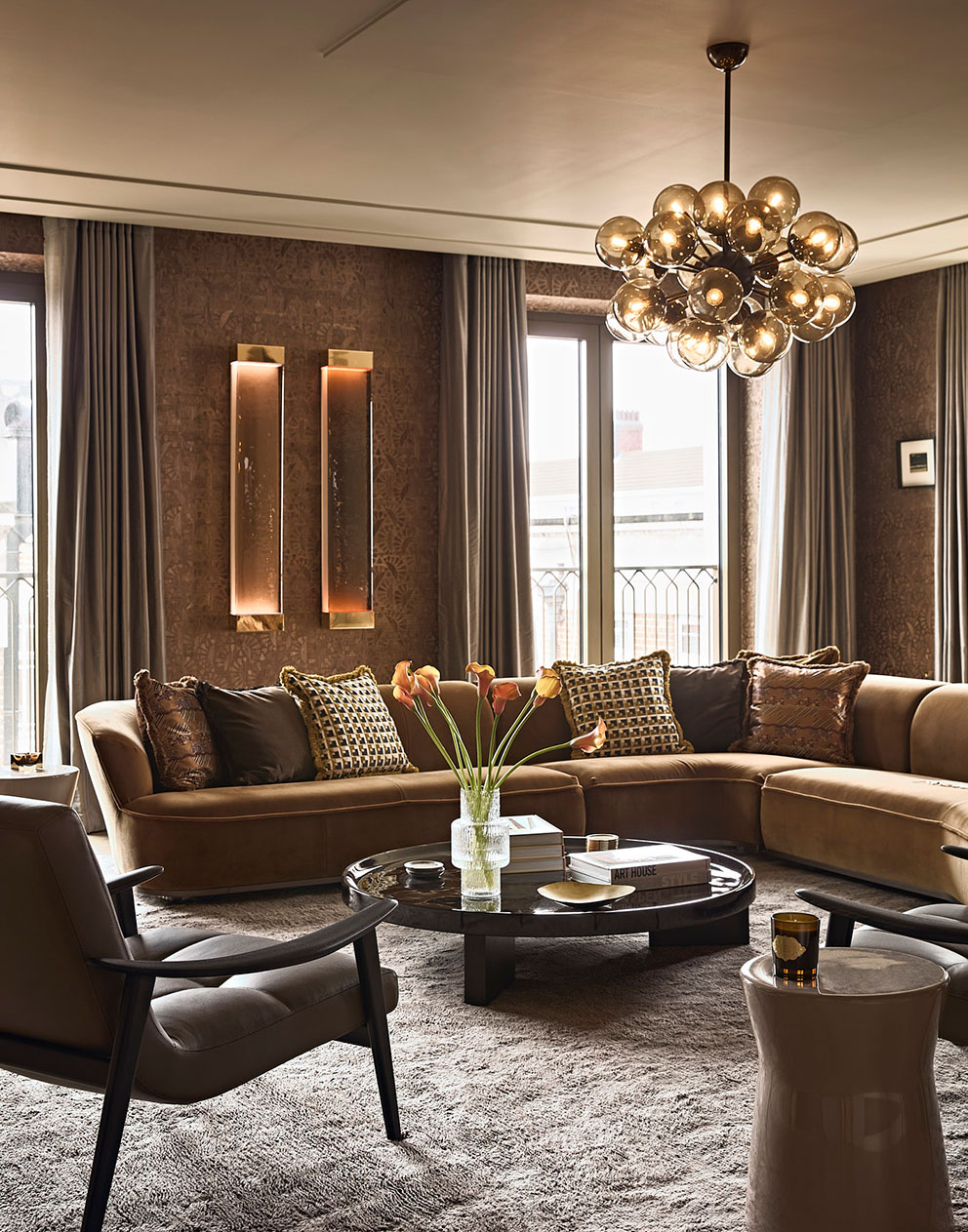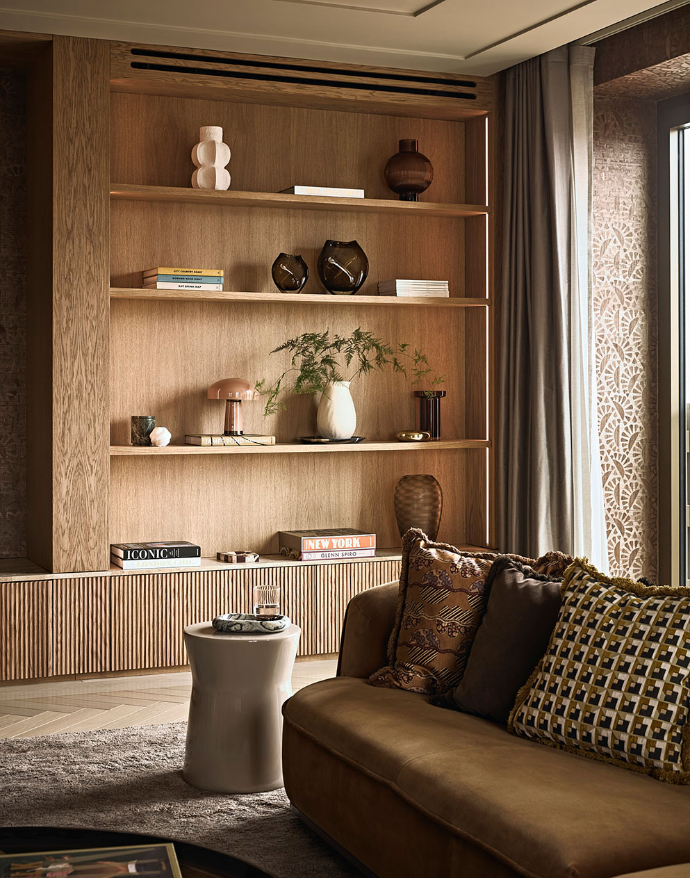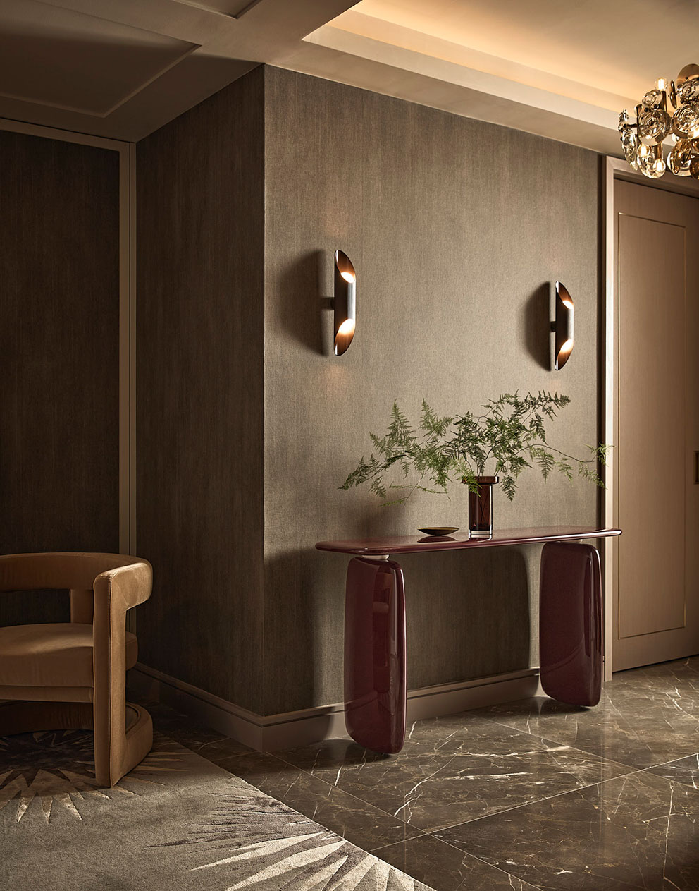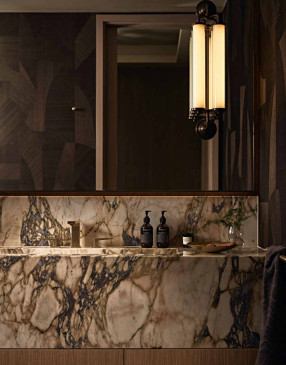 This Pied-à-Terre reimagines an apartment originally completed to a developer’s specification, transforming it into a richly personal home inspired by 1970s luxury. Designed for a client with a strong appreciation for texture and materiality, the scheme layers tactile finishes with striking marble to create depth and visual interest. The space was carefully considered to support entertaining and bring the family together, resulting in a beautifully moody and inviting environment, tailored to the client’s way of living.